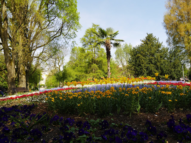 After having the walk around the banks and the City Garden with its beautiful flowers, I was also interested in exploring the old town of the city, starting with the Niederburg district with its narrow, winding streets and houses from the Middle Ages. I wasn't only impressed by the beautiful houses and wine bars, I also really loved the flower balls all around the old town, which gave the city a fantastic atmosphere of spring. By following the main street, I reached the Minster of Konstanz, where it was possible to climb up the stairs of the bell tower. From there, I could spot the Alps around the Bodensee. Before, I couldn't see them because of the high humidity and the not so clear sky. Also the Gothic style Minster itself was really beautiful. After having a cappuccino around the Minster Square, there were only three more sightseeing places, I wanted to see - the Kaiserbrunnen, a fountain in the centre of the old town decorated with a three-headed peacock with three papal crowns and sea hares, the Schnetztor, the most Southern city boundary of the 14th century and picturesque city tower and the Hussenstein, a monument, dedicated to Jan Hus and Jerome of Prague, who were burned as heretics during the Council of Konstanz in the Middle Ages. Additional, I was really surprised and impressed by the wall paintings on the buildings in the city centre. It was really unique and for me, it was one of the highlights in the old town. I finished my walk around the city and went back to the train station, where my train back was cancelled, so that I had an additional hour to enjoy the sunshine at the Bodensee. For the next time, I'm planning to go to the Bodensee area with my bike and a tent for a little round trip around the whole lake.